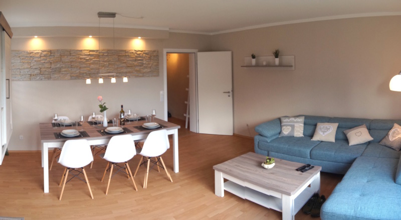 Die Wohnung bietet mit zwei Schlafzimmern, Bad, Küche, einem großen Wohn-/ Esszimmer und nicht zuletzt der großen Sonnenterasse die idealen Voraussetzungen für einige entspannte Tage mit der Familie und Kindern oder Freunden. Die Wohnung ist auf eine Nutzung mit 4-6 Personen ausgerichtet.